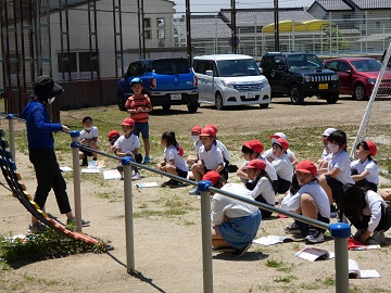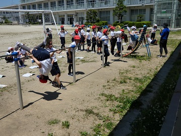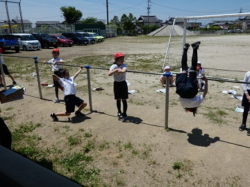 逆上がりの練習をしました。先生から、コツをおしえてもらって一生懸命に練習しました。