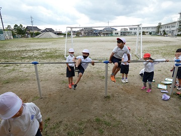 鉄棒練習をしている子どもたちの横を通ると、「僕の技を見てください」と呼び止められ、逆上がりや足かけあがりなどの技を見せてくれました。