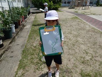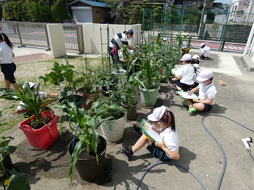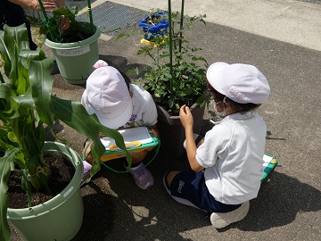 毎日すごいスピードで成長する野菜の記録を一生懸命にとっています。水やりも欠かさずやっています。キューリやトマトに実がなり始めました。