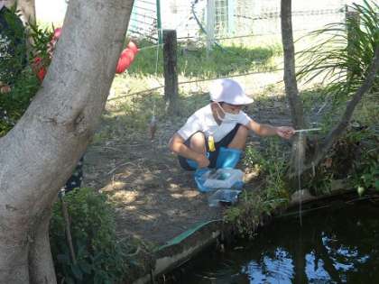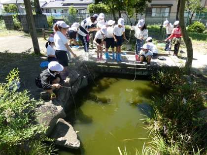畝部愛ランドにある池でザリガニ釣りをしました。ザリガニが釣れるたびに、子どもたちは大はしゃぎしていました。