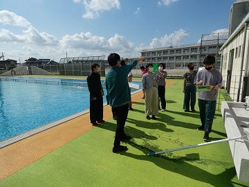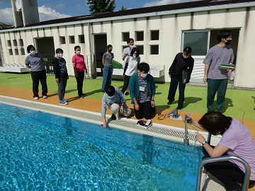 プール開きを来週の火曜日に控えて、プールの水をきれいに衛生的にプールを保つための研修を行いました。担当の先生が豊田市の研修会で学んだ管理の仕方についてしっかりと伝達してくれました。