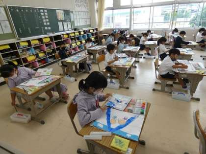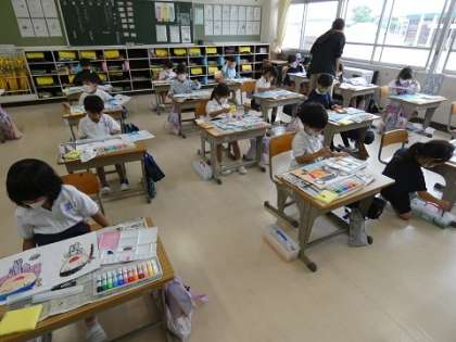 先日、初めて絵の具を使った1年生は、今日は上手に絵を描いていました。1年生は、ひらがなや歌、絵を描くことなどいろいろなことを勉強して、表現することができるようになってきましたね。