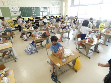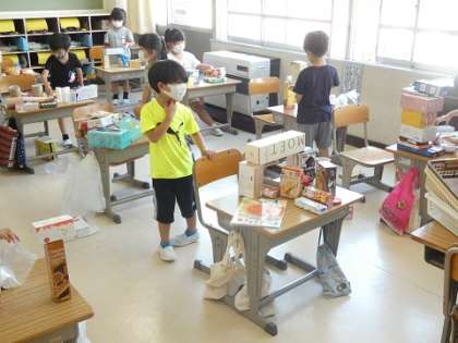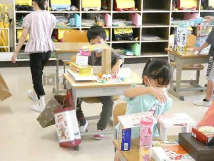家から持ってきた段ボール箱を組み合わせていろいろな形を作りました。