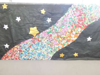 5組 天の川のちぎり絵 公開日 2022/06/29 更新日 2022/06/29 お知らせ 5組の教室の前の廊下に写真のような素敵な「天の川」のちぎり絵が掲示されていました。きれいなちぎり絵を見ながら、「今年の七夕は晴れるといいなあ」と思いました。(5年生のキャンプは7月6日・7日です。)