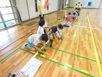 風やゴムのはたらきの勉強で、ゴムダッシュカーを使って走行距離を競っていました。