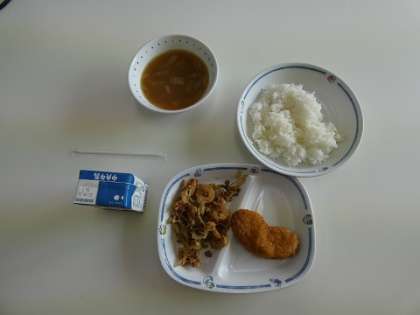 今日は、写真のような新メニューが登場しました。「切り干し大根のソース炒め」です。味の感想は、お子様に聞いてください。