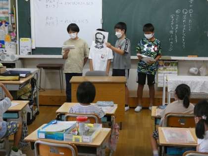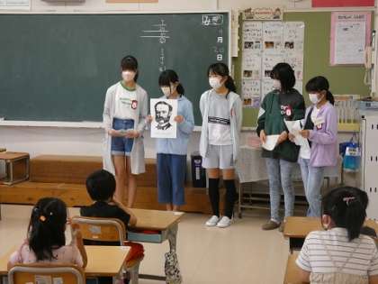 福祉赤十字委員会の6年生たちが、1年生の教室に来て、青少年赤十字入会式をしてくれました。