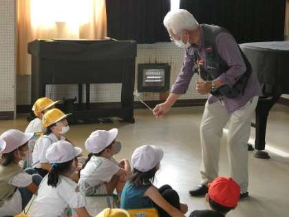 1年生と4年生が生き物調査に参加しました。1、2時間目は1年生で前半は座学、後半は校庭で生き物を探しました。