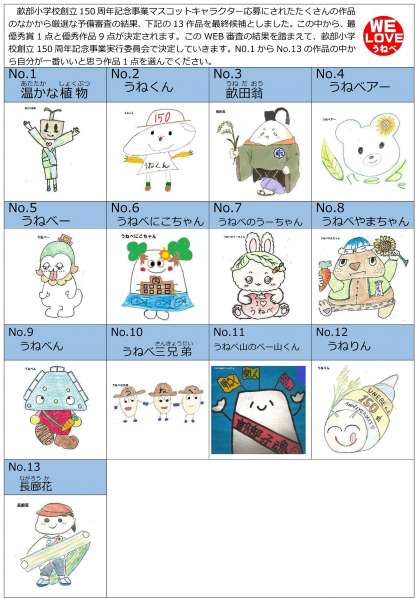 畝部小学校創立150周年記念事業 マスコットキャラクター投票について