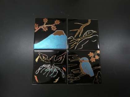 漆の板に漆を塗りながら、乾く前に金属の粉を振りかえて、美しい模様を描きました。