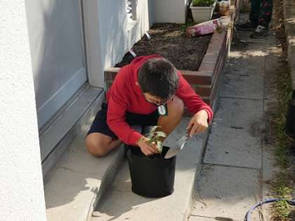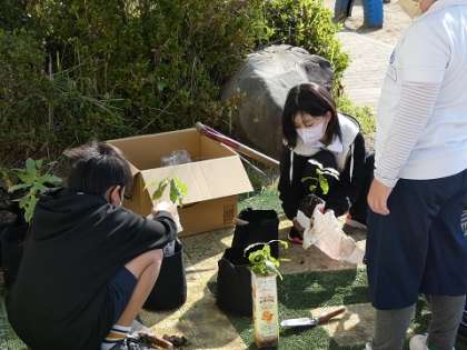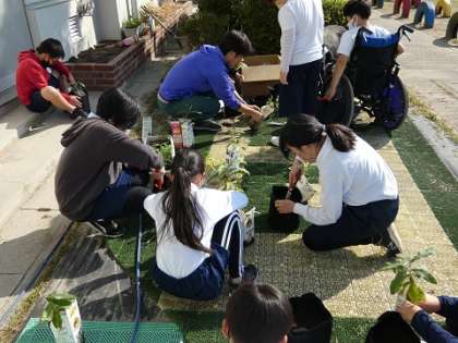 大きくなってきたどんぐりの苗を植え替ました。5年生が卒業するときに全員が博物館の森に植えれるように大切に育てていきましょう。