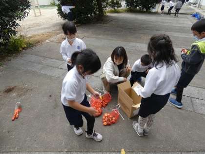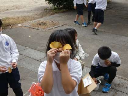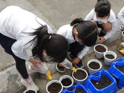 秋空の下でチューリップの球根を植えました。チューリップの花が咲くころには、2年生になりますね。