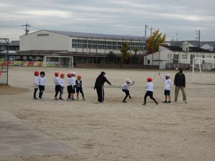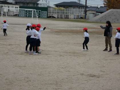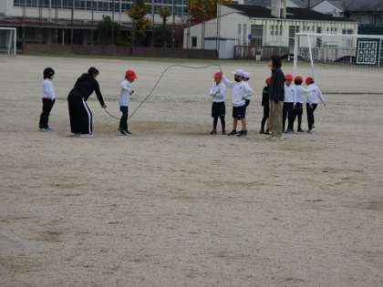 ファミリー班活動でなかなかうまく跳べなかった大繩跳びの練習をしていました。