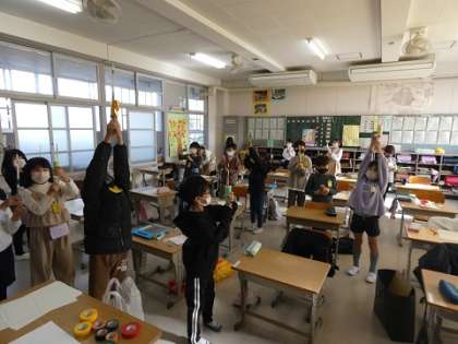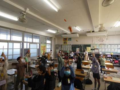 おもちゃ作りも楽しいけど、遊ぶのはもっと楽しいですね。ゴムロケットをみんなで合わせて飛ばしてみました。