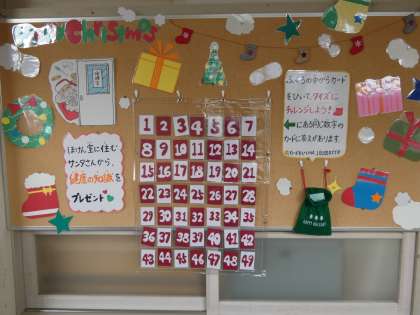 保健室前の掲示板が更新されていました。クリスマスバージョンになっていました。楽しく、健康維持に役立つ知識を学習できるように工夫されています。