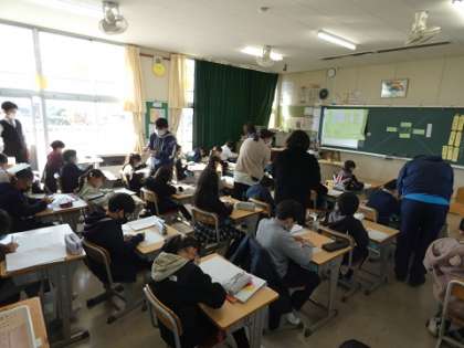 たくさんの先生たちの見ている中で国語の研究授業が行われました。単元名は「こころの動いたことを詩で表そう」で、生活の中で心が動いたことを探して、想像を広げ、そのときの心の動きが伝わるように、言葉を集めたり、選んだりして、伝えたいことを明確にすることを目標に行われました。