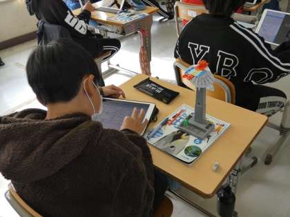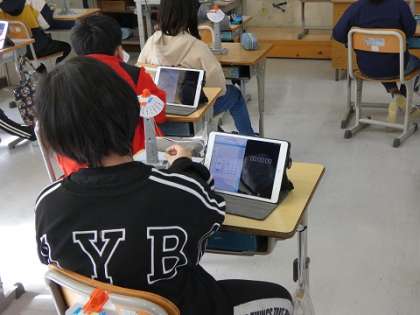 振り子の実験をしていました。10往復する時間を計り、記録しました。学習タブレット(ipad)の画面上に、ストップウオッチのアプリと記録・報告用のアプリの二つの画面を出し、測定、記録、提出、比較などを当たり前に行っていて、感心しました。