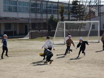 3年生 体育の授業 公開日 2022/12/15 更新日 2022/12/15 お知らせ すっかり、トヨタの小学校では、定番になったタグラグビーで盛り上がっています。 タグラグビーは、楕円形のボールでトライを目指します。ボールを前にはパスできません。タックルの代わりに相手のタグを取ります。タグを取られたら、もってているボールをパスしなくてはいけません。同じチームが4回タグを取られると相手ボールになります。