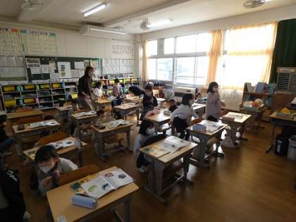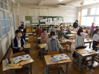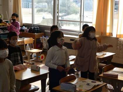 「歌詞から様子を思い浮かべて歌おう。」と歌を歌っていると、自然に体が動いてくるようです。「タンポポ」になったり、「クジラ」になったり、「こりす」、「星」と、なかなか忙しそうです。