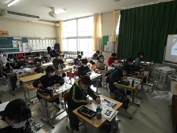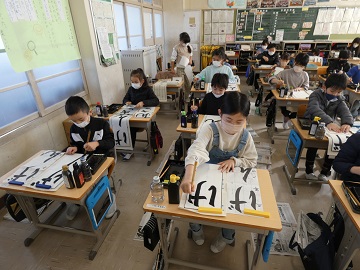 3年生からは、毛筆です。「ゆっくり、ていねいに」書きました。どの教室もとても集中していました。