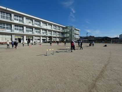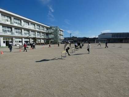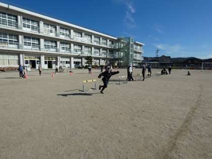 運動場でハードルの練習をしています。意欲的に何度も練習していました。