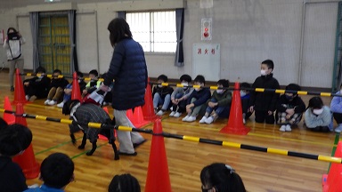3年生は、福祉実践教室の授業を受けました。盲導犬を使っている方の話を聞いたり、盲導犬の助けを借りて歩いているところを見たりしました。
