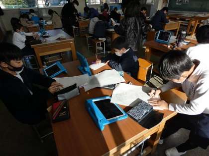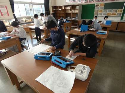 自画像の版画の下絵を丁寧に描きました。ここでも、学習タブレットを活用していました。