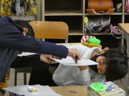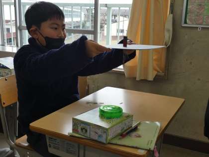 磁石が、厚紙ごしに何個のクリップをつけれるのか実験していました。みんな、真剣です。