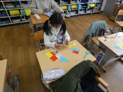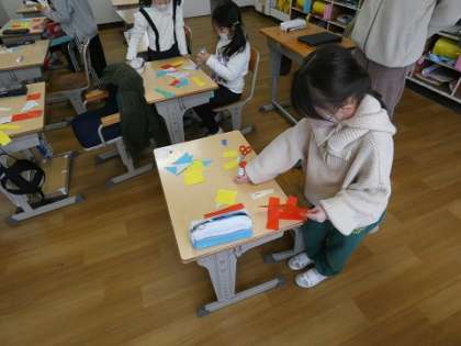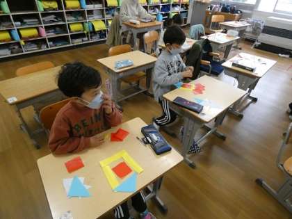 いろいろな形を組み合わせて作品を作りました。遊びながらいろいろな形の特徴を覚えていきます。