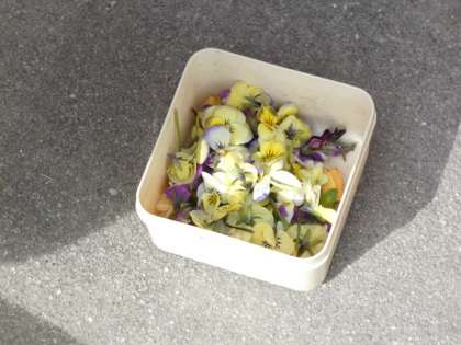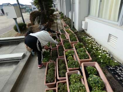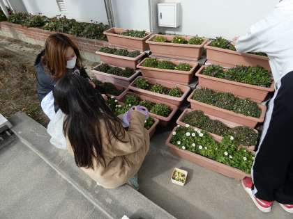 卒業式に会場を彩るプランターのビオラの栽培をしています。公務手さんや校務の先生が、ビオラがエネルギーを蓄えれるように花摘みをしていると、周りにいる子が手伝ってくれます。