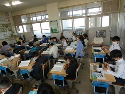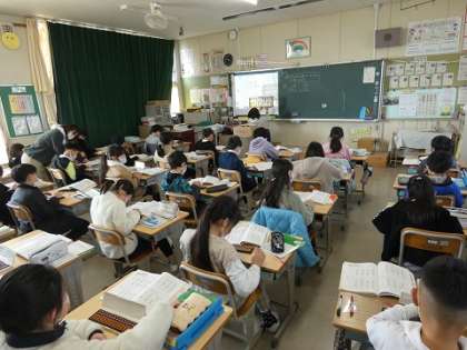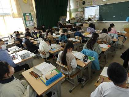 机の上にあるのは、ipadとそろばん、違和感を感じる人もいるかもしれませんが、3年生と4年生の算数では、そろばんを扱います。時代は、変わっても子どもの成長に効果的な学習方法は、残るということですね。