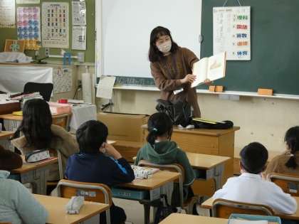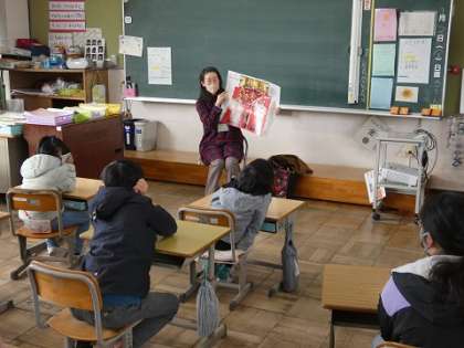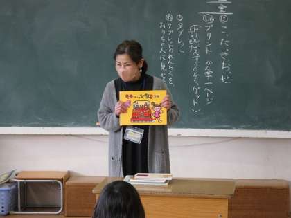 今年度、最後の朝の読み聞かせがありました。今日も、たくさんのボランティアさんたちが、読み聞かせをしてくれました。1年生の教室では、雛人形のお話でした。