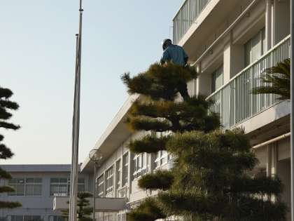 3月20日の卒業式に向けて、環境整備を進めています。教職員でできる修繕や整備は教職員で行いますが、できないことは、プロの業者にお願いします。本校は、立派な松が多いので年に一度、選定を依頼します。
