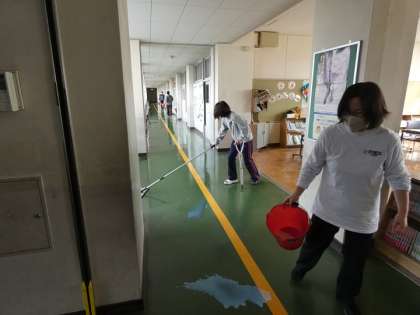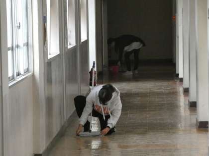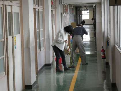 子どもたちの下校後、先生たちは、打ち合わせをした後で廊下を掃除して、ワックスをかけました。
