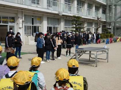 下校前、運動場に集まった時に通学班でお世話になった6年生とお別れ会を行いました。6年生と学校で会えるのは、最後になりますが、6年生が卒業した後も5年生を中心に頑張ってくれそうです。