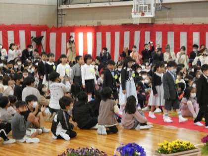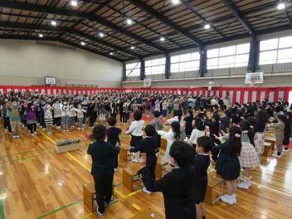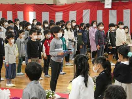 入学式・始業式 公開日 2023/04/06 更新日 2023/04/06 お知らせ 47名の新入生が全員が元気に体育館に入場してきました。そして、一人一人の名前が呼ばれ堂々と返事してくれました。 PTA会長と来賓の方が式に参列してくださいました。 児童代表の歓迎の言葉の終わりに、全校で幸せになる合言葉「畝部、ハッピース」をしました。早速、明るい雰囲気になりました。