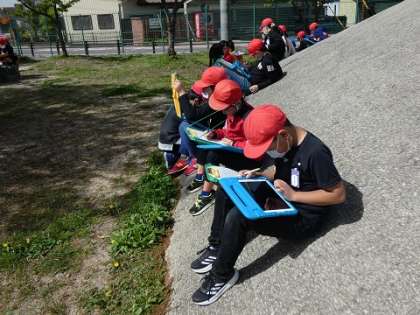 季節と生き物の授業で、春の生き物(植物)を観察しました。スケッチが完成しなかった人もipadで写真を撮って、教室で続きを描きました。