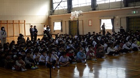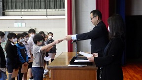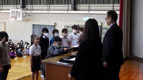 体育館で全校児童が参加して、全校朝会が行われました。全校児童が見守る中で、3年生以上の学級代表、運営委員、委員長の認証式が行われました。
