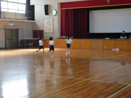 体力テストの持久力を見るシャトルランを行いました。苦しくても頑張って発している子に見ている子たちの声援が飛びます。