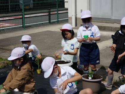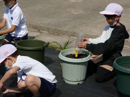 トウモロコシやキュウリ、ナス、トマトなど思い思いの夏野菜の苗を植えました。しっかりとお世話をしていきましょう。
