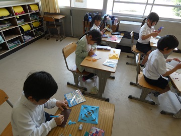 「ちょきちょきかざりをつくろう」折り紙を折って、はさみで切っていろいろな模様の飾りを作りました。