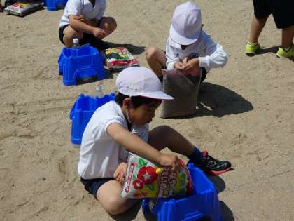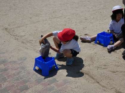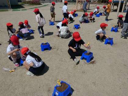 土を入れ、肥料を入れ、種をまき、水を撒いて朝顔の発芽を待ちます。