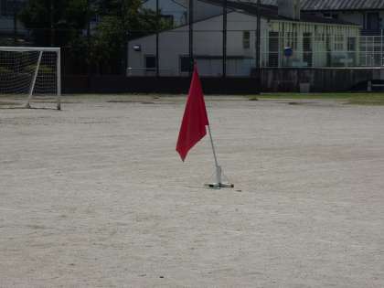 昨年、テレビのニュースでも取りあげられた「熱中症対策の赤い旗」が、今日の2時間目に運動場に立ってしまいました。この旗は、熱中症対策で気温35度以上か、WBGTの値が31度以上になった時に運動場に立てられ、運動場で遊んだり、体育をすることができなくなります。