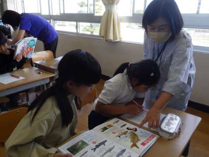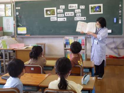 最初に、司書の先生から図鑑の仕組みや目次・索引から調べる方法を教えていただきました。その後、ペアになって、図鑑クイズに挑戦しました。子どもたちは、目次や索引から調べるお題のページを開いて、楽しく答えを見つけていました。