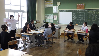子どもたちの下校後、先生たちは、研究授業の指導方法について意見を交わしたり、今年度の畝部小学校の研究で取り組んでいる「振り返り」について、意見を出し合いました。