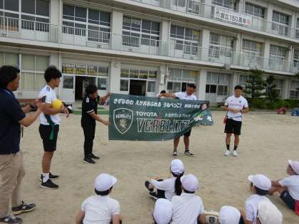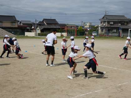4年2組 タグラグビー教室 トヨタヴェルブリッツ 公開日 2023/06/01 更新日 2023/06/03 お知らせ トヨタヴェルブリッツの竹井勇二選手、岡田優輝選手、大籔洸太選手が、畝部小学校で4年生にタグラグビーを教えてくれました。大籔洸太選手は、豊田市の選手ということで身近な存在に感じました。 子どもたちは、とっても大きなラグビー選手の体にびっくりしていました。 1時間があっという間に過ぎるくらい子どもたちは、楽しく一生懸命にタグラグビーを練習しました。