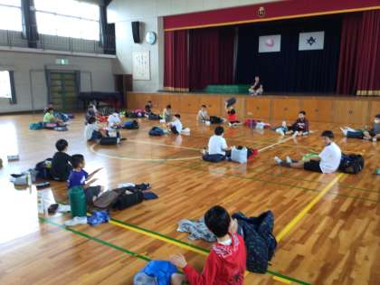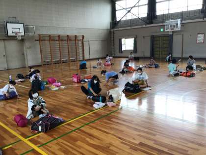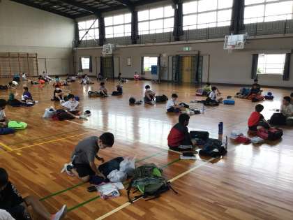 いよいよ明日は、待ちに待った山の学習(キャンプ)です。体育館で忘れ物がないか荷物点検して準備万端です。