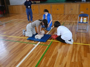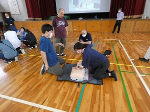 AEDと心マッサージの実習では、先生たちのチームワークの良さをほめていただきました。