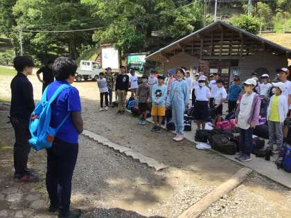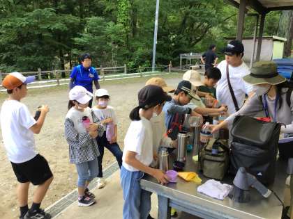 テントやトイレ、炊事場などの掃除をしました。全班が点検に合格したので、水分を補給して、所員さんについてフィールドアスレチックの会場に出発しました。