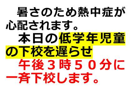 低学年の下校を遅らせます。 公開日 2023/07/10 更新日 2023/07/10 お知らせ 猛烈な暑さのため熱中症が心配されます。本日の低学年児童の下校を遅らせ午後3時50分に一斉下校します。ご協力よろしくお願いします。